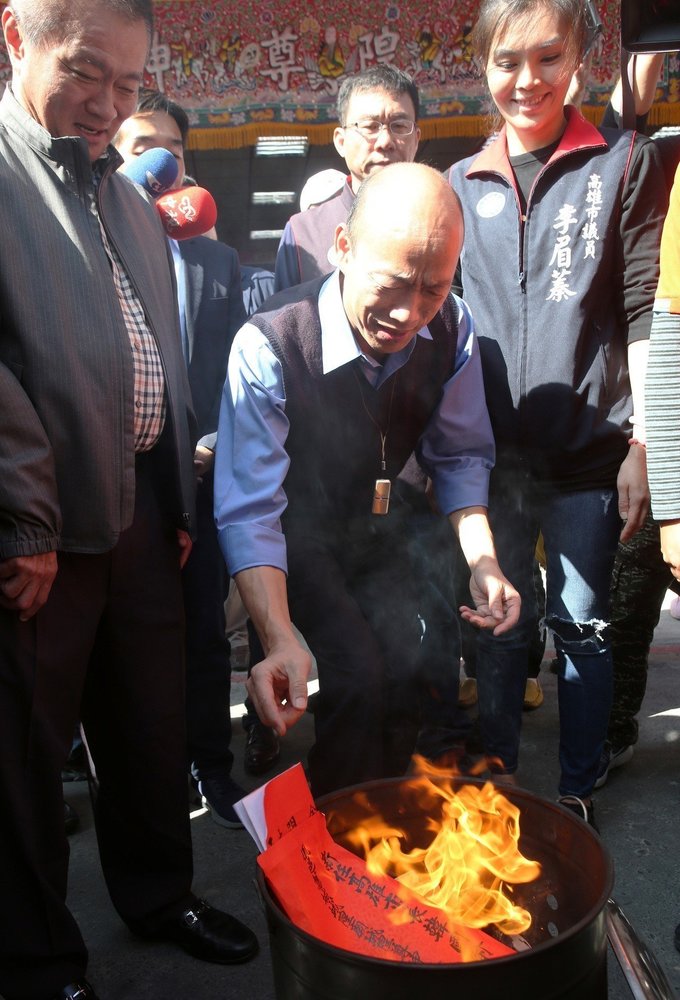 參拜結束後,韓國瑜與廟方主委在廟埕前合照,後方在修葺廟宇的工人從上方大喊「市長好」也一同入境,韓離去前,不少民眾衝上前與他合照、握手,還高喊「市長加油!」